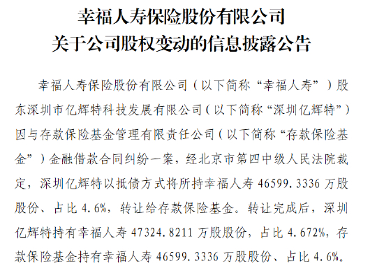 5月8日金融一线消息,幸福人寿保险股份有限公司(以下简称“幸福人寿”)发布公告称,幸福人寿股东深圳市亿辉特科技发展有限公司(以下简称“深圳亿辉特”)因与存款保险基金管理有限责任公司(以下简称“存款保险基金”)金融借款合同纠纷一案,经北京市第四中级人民法院裁定,深圳亿辉特以抵债方式将所持幸福人寿约4.66亿股股份、占比4.6%,转让给存款保险基金。转让完成后,深圳亿辉特持有幸福人寿约4.73亿股股份,占比4.672%,存款保险基金持有幸福人寿4.66亿股股份、占比4.6%。