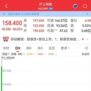 沪上阿姨发行价113.12港元/股,开盘价190.6港元/股,较发行价上涨68.5%,截至收盘上涨40.03%,最新市值166.07亿港元。该股上市首日的强势表现并不出人意料,上市前一日,富途暗盘交易收盘涨幅高达62.48%。