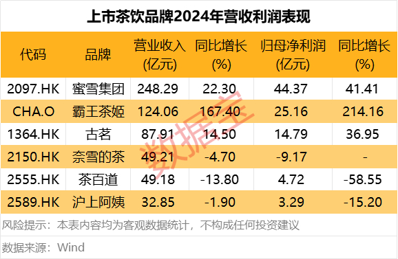 从经营情况看,盈利规模最大的是蜜雪集团,2024年归母净利润44.37亿元,同比增长41.41%;归母净利润增速最高的霸王茶姬,2024年同比增长214.16%。奈雪的茶2024年由盈转亏,营收小幅下滑,净利润亏损9.17亿元;茶百道全年营收下降13.8%,归母净利润大幅下降58.55%。