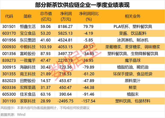 据证券时报·数据宝不完全统计,A股新茶饮供应链上市企业约有12家。包括提供果葡糖浆、麦芽糖浆的中粮科技;提供冰淇淋机的东贝集团;提供原料果汁的田野股份以及提供植脂奶油的海融科技等。