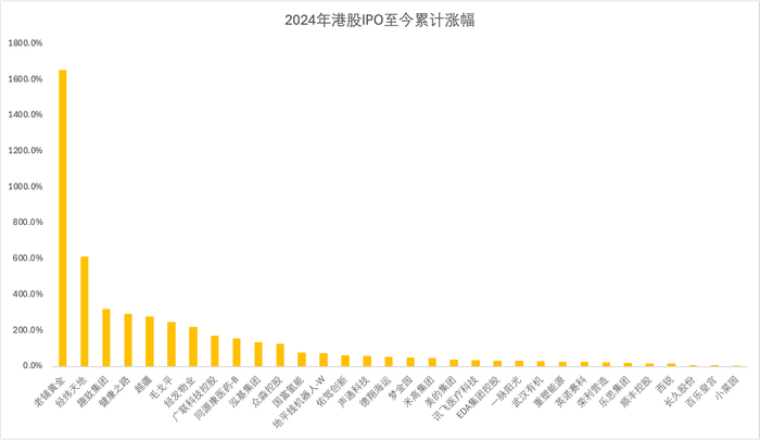 相反,一些中小型企业或业务相对冷门的公司,反而在上市后获得了更稳定的上涨。例如 $老铺黄金(06181)$ 累计涨幅超过16倍,成为2024年最令人惊艳的新股之一。其产品定位明确,叠加金价上涨趋势,使得市场对其盈利能力和中长期增长预期保持乐观。