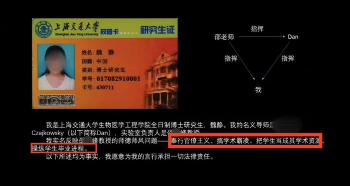 5月7日深夜,上海交通大学生物医学工程学院博士研究生魏静,实名举报实验室负责人邵某峰教授学术霸凌一事,引发关注。