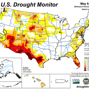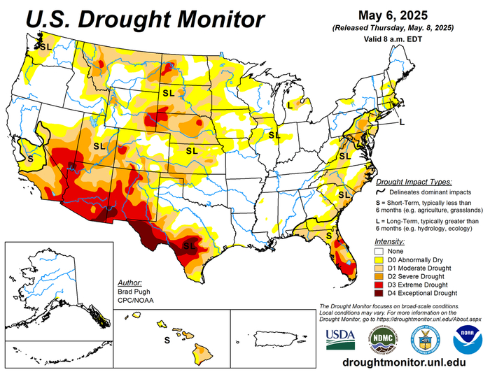 根据美国农业部(USDA)经济首席办公室(OCE)及世界农业展望委员会(WAOB)于2025年5月8日发布的最新《农业干旱报告》显示,截至2025年5月6日,美国多个主要农产品产区正经历中度至更严重级别的干旱(D1+)。该报告基于美国干旱监测系统的数据,并结合了NASS 2022年农业普查数据进行分析。报告指出,多种主要农作物和牲畜的生产区域受到不同程度的干旱影响: