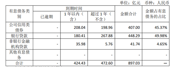 当中,1年以内有息债务424.43亿元,超过1年有息债务472.6亿元。短期有息债务占了近五成。