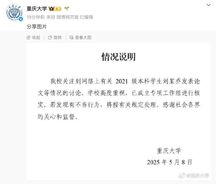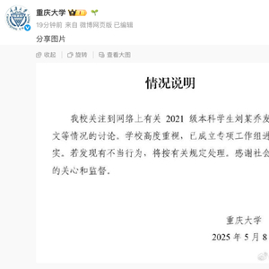 5月8日晚,针对网传“本科生已发14篇SCI论文”事件,重庆大学发布情况说明:关注到网络上有关2021级本科学生刘某乔发表论文等情况的讨论。学校高度重视,已成立专项工作组进行核实。若发现有不当行为,将按有关规定处理。感谢社会各界的关心和监督。