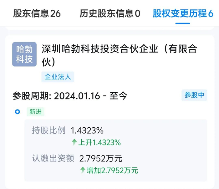 增资后,哈勃先后参投了芯曌科技的A轮融资、同元软控的A+轮融资,并出现在千寻智能的股东名单中。根据天眼查App,哈勃对千寻智能的持股比例为1.4323%。