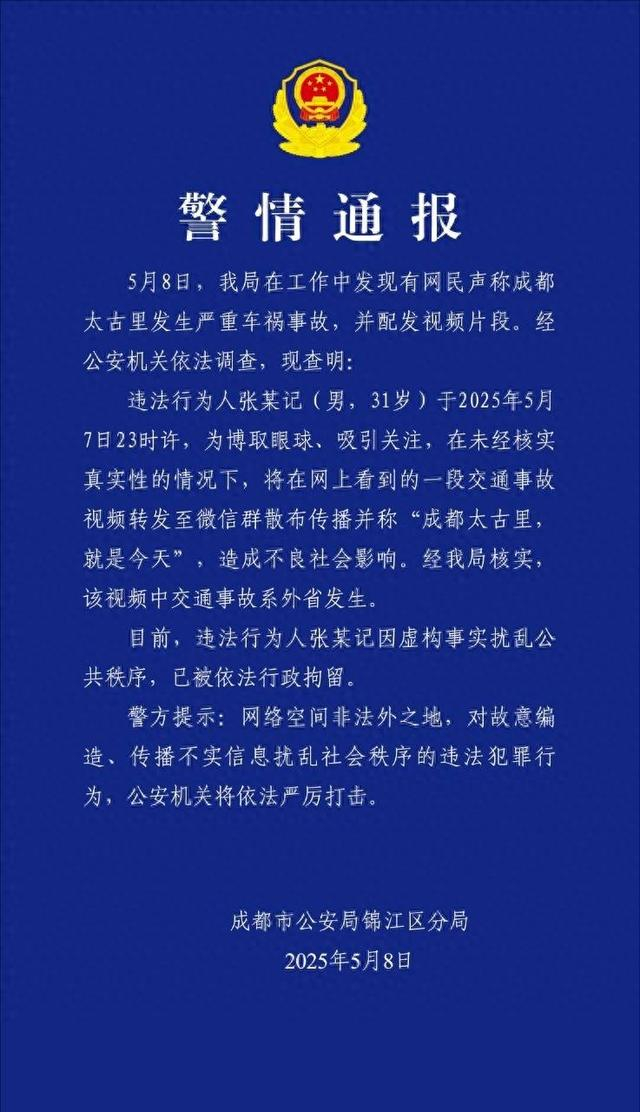 违法行为人张某记(男,31岁)于2025年5月7日23时许,为博取眼球、吸引关注,在未经核实真实性的情况下,将在网上看到的一段交通事故视频转发至微信群散布传播并称“成都太古里,就是今天”,造成不良社会影响。经核实,该视频中交通事故系外省发生。