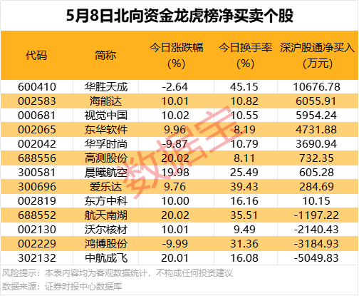 今日龙虎榜现身个股中,北向资金净买入的有9只,华胜天成获净买入1.07亿元,净买入居首;海能达、视觉中国均获净买入超5000万元。