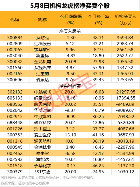5月8日龙虎榜中,共8股获机构净买入超千万元,狄耐克获机构净买入3594.84万元,净买入居首;红墙股份、东华软件、新坐标等获机构净买入均超2000万元。