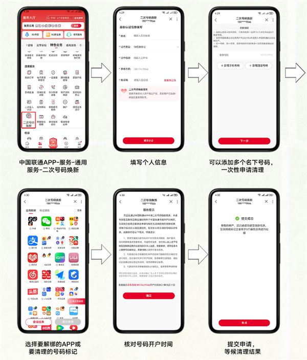 据介绍,"二次号码"用户登录中国联通APP,在"服务->通用服务->二次号码焕新"提交解绑申请,即可快速解除前任机主与互联网应用的绑定关系,清除历史绑定遗留问题,让用户手机号码焕然一新。