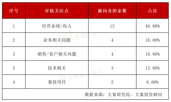 从上会问询要点来看,经营业绩/收入、销售/客户问题、业务相关问题被重点关注,其中有12家企业被问及了经营业绩/收入相关问题,占比达到48%;其次便是销售/客户问题、业务相关问题,各有4家企业被问及,各占比16%。