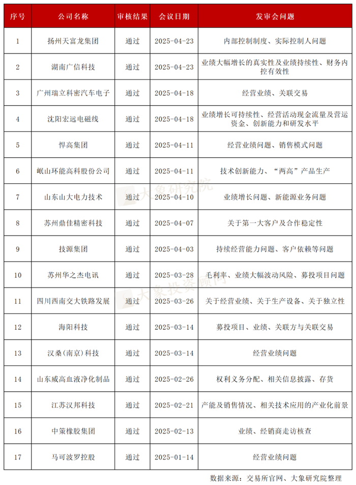 截至4月30日,2025年A股首发上会企业17家,均获通过(二次上会按最终结果计算),过会率100%。