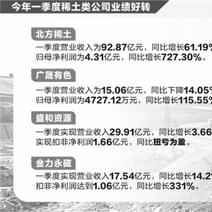 不过得益于稀土市场部分产品价格回升,今年一季度稀土类公司业绩有所好转,比如中国稀土营业收入为7.28亿元,同比增长141.32%。