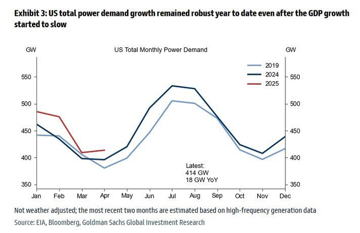 财经博客Zerohedge分析称,值得注意的是,在第一季度GDP增速放缓的背景下(完全是由于企业抢在关税上调前大量进口,以及政府支出减少,这两项都与特朗普政策有关),美国经天气调整后的电力需求增速与GDP增长之间的差距首次转为正值,从上月的-0.9个百分点跃升至+0.4个百分点,而过去十年的平均水平则为-1.9个百分点。换句话说,从历史关联来看,这意味着当前美国GDP增速可能已达到3%甚至更高。