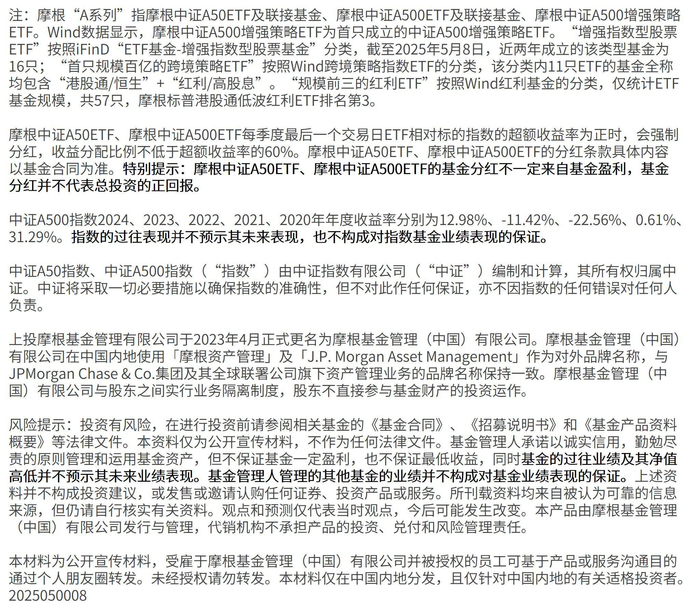 此外,摩根资产管理旗下摩根标普港股通低波红利ETF(证券代码:513630)于近期规模突破100亿元(Wind数据显示,截至2025.5.7,摩根标普港股通低波红利ETF规模为101.91亿元),成为首只规模突破百亿的跨境策略ETF,同时也是国内上市的规模前三的红利ETF。从设置季度强制分红机制的摩根中证A50ETF、摩根中证A500ETF,到首只规模突破百亿的跨境策略ETF,再到率先成立中证A500增强策略ETF,摩根资产管理致力于依托国际视野和本土实践,持续为客户提供特色的ETF产品和差异化的投资体验。