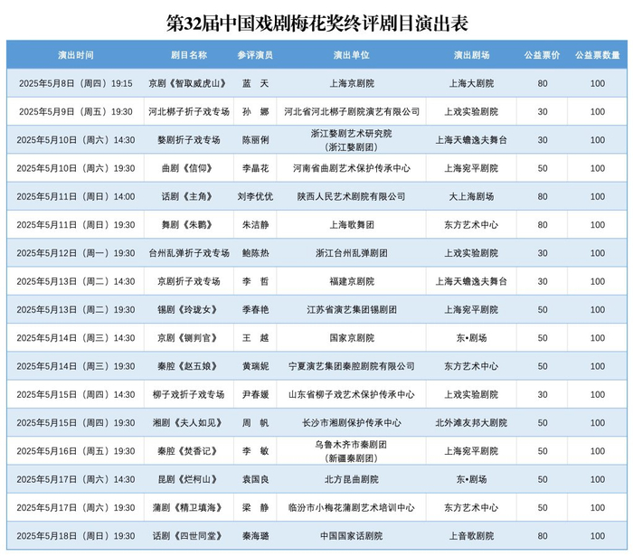 在开幕演出之后,未来近半个月,还有来自全国11个戏曲剧种和话剧、舞剧等戏剧艺术门类的其他16位演员,将在上海集中现场展演,经终评评委现场观摩后,差额评出最终15朵“梅花”。终评结果将于5月21日晚第十届中国戏剧奖颁奖晚会上,与第26届曹禺戏剧文学奖一同揭晓。