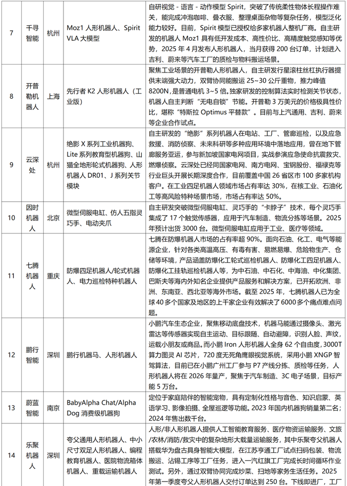 从企业竞争力看,报告涉及的30家领军企业中,智元机器人表现突出,其自研了机器人大脑-小脑-本体全栈软硬件技术,包括具身基座大模型、具身一站式开发平台和机器人整机。在此基础上,智元机器人打造了远征A2双足人形机器人、采推一体的精灵G1轮式通用“具身智能”机器人、科研教育的灵犀X1全栈开源双足机器人并建成全球最大具身数据采集工厂,可日产数万条真机及仿真数据,其开源数据集HuggingFace在全球广受欢迎。灵心巧手研发的商业级Linker Hand“灵巧手”全球市场占有率80%,市场数据优异。而在2025年央视“春晚”大放异彩的宇树科技也跻身三甲,自研的四足机器人年销量超过2万台,占全球同类产品近七成市场份额。