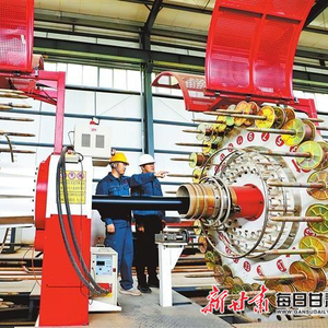 5月7日,临泽县宏伟预制构件厂自动化生产线上,工人正在查看环保管道生产情况。今年以来,该厂产销两旺,生产的各类环保管道销往内蒙古、新疆等地。新甘肃·甘肃日报通讯员 王将