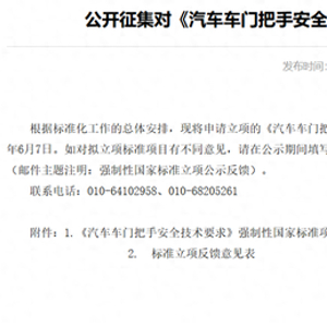 据工信部网站消息,工信部科技司5月8日起公开征集对《汽车车门把手安全技术要求》强制性国家标准制修订计划项目的意见,截止日期为2025年6月7日。