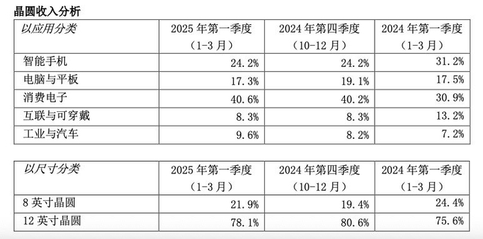 根据披露内容,净利润的上升主要由于晶圆销量上升、产品组合变化使营业收入同比增加所致。今年一季度,晶圆业务收入占比95.2%,比去年同期上升了2.2个百分点。晶圆收入中,40.6%来源于消费电子,占比最多,其次是智能手机、电脑与平板,分别占比24.2%和17.3%。以尺寸分类,8英寸和12英寸晶圆业务收入占比分别为21.9%、78.1%。