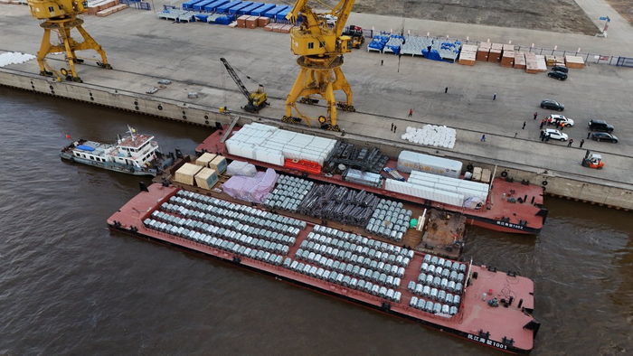5月8日,搭载钢卷、玻璃等共计1810.7吨货物的“宾个推222”船队自中国抚远莽吉塔港起航,驶向俄罗斯哈巴罗夫斯克港。至此,2025年抚远国际客运、货运口岸全面开通。