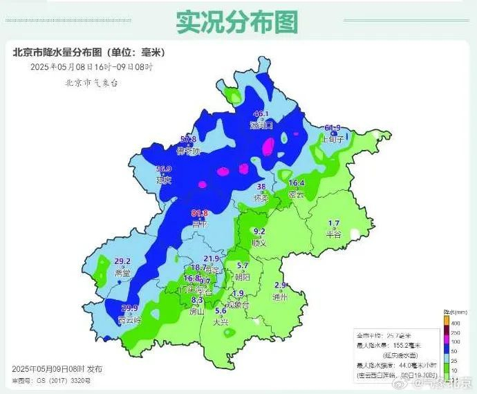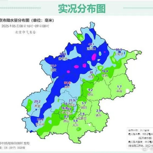 北京市气象台发布5月8日16时至9日8时,全市平均降水量25.7毫米,已达到大雨量级。城区平均16.5毫米,西北部52.8毫米,西南部31.3毫米,东北部25.6毫米,东南部3.2毫米。最大降水量出现在延庆暖水面155.2毫米;最大降水强度出现在密云西白莲峪,08日19时-08日20时降水44.0毫米。最近一小时最大降水量为大兴魏善庄23.1毫米。