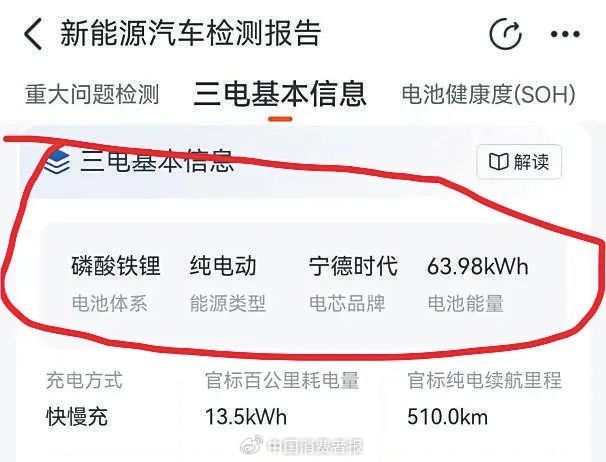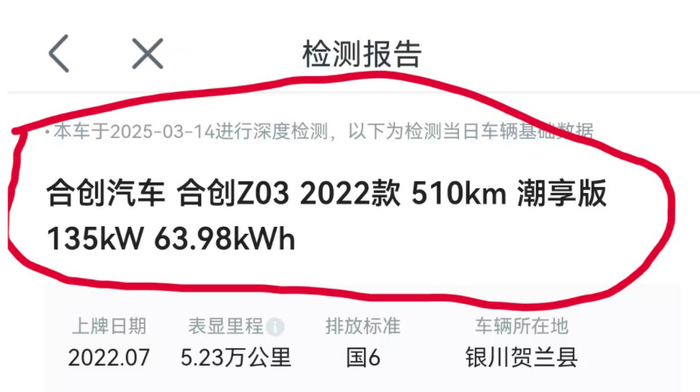 展示车型信息是如何“变身”的呢?记者通过采访和对比了解到以下情况👇👇👇展示信息“合创潮酷版64.23kWh”,但未见车架号,平台声明“车辆参数配置仅供参考,具体参数以实车为准”;商家提供的第三方检测报告显示为“合创潮酷版63.98kWh”,车架号尾号为“8443”,和行驶证信息一致,但无电池信息和配置信息,赵先生误以为是展示车;查博士检测时赵先生输入车架号,报告显示为“合创潮酷版63.98kWh”,报告无配置信息,电池为磷酸铁锂电池,但赵先生第一时间未注意到;赵先生打算卖车时拿到第三方检测报告,显示为“合创潮享版63.98kWh”。