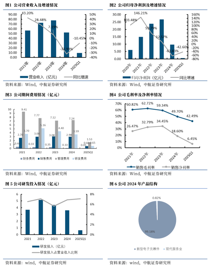 行业竞争加剧及调整影响业绩,新兴战略行业挖掘新增量。2024年,公司营收(52.19亿元,-32.99%)和归母净利润(9.70亿元,-63.83%)均大幅下降,主要系在新型电子集中采购、单价下调、门槛降低等情况下,基础元器件的行业竞争加剧,同时,装备采购节奏调整、行业技术更新速度加快、研发转化周期延长等因素挤压公司利润空间,进而导致公司毛利率(49.70%,-9.65pcts)下降,而净利率(18.60%,-15.85pcts)降幅高于毛利率下降幅度,我们认为主要系期间费用率(26.67%,+7.48pcts)增加,以及公司计提的资产减值损失(-1.06亿元,+41.71%)和信用减值损失(-0.94亿元,+83.66%)增加所致。