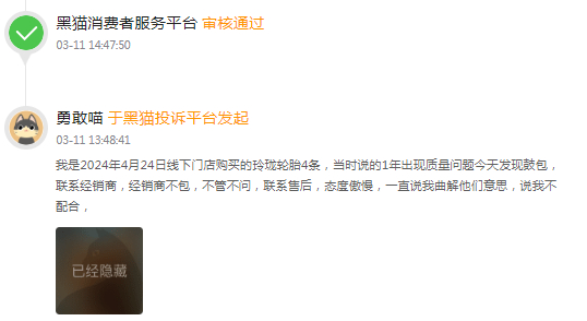 黑猫投诉官方网站显示,玲珑轮胎多次因鼓包问题遭投诉,部分消费者反映其售后“踢皮球”的问题。例如,有网友在3月11日投诉称,其于2024年4月24日线下门店购买玲珑轮胎4条,发现鼓包后,联系经销商,经销商不管不问,联系售后,售后态度傲慢。1月12日,亦有用户投诉称,其2024年11月13日购买玲珑轮胎,使用2个月不到,行驶公里数不超500公里,轮胎出现鼓包问题。该用户称:致电厂家售后,说是其个人行驶压硬物造成,不给予售后,这质量问题谁负责?