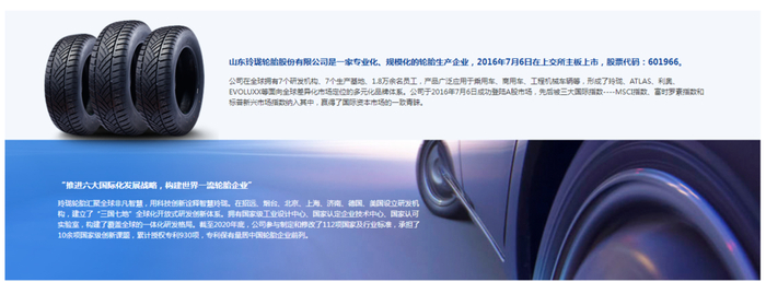 据玲珑轮胎官方网站介绍,公司是一家专业化、规模化的轮胎生产企业,2016年7月6日在上交所主板上市,股票代码:601966。公司在全球拥有7个研发机构、7个生产基地、1.8万余名员工,产品广泛应用于乘用车、商用车、工程机械车辆等,形成了玲珑、ATLAS、利奥、EVOLUXX等面向全球差异化市场定位的多元化品牌体系。