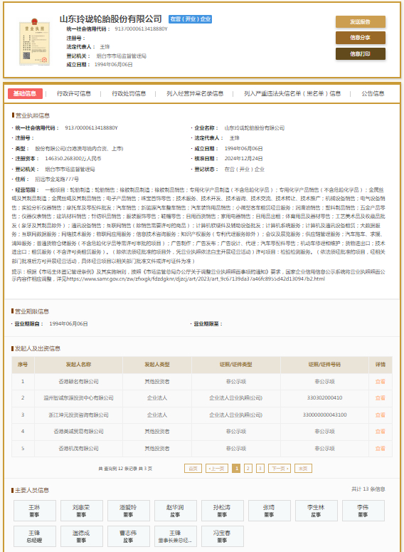 国家企业信用信息公示系统显示,山东玲珑轮胎股份有限公司成立于1994年,注册资本146350.2683万元人民币,法定代表人王锋。