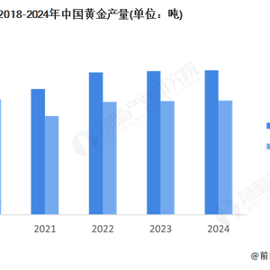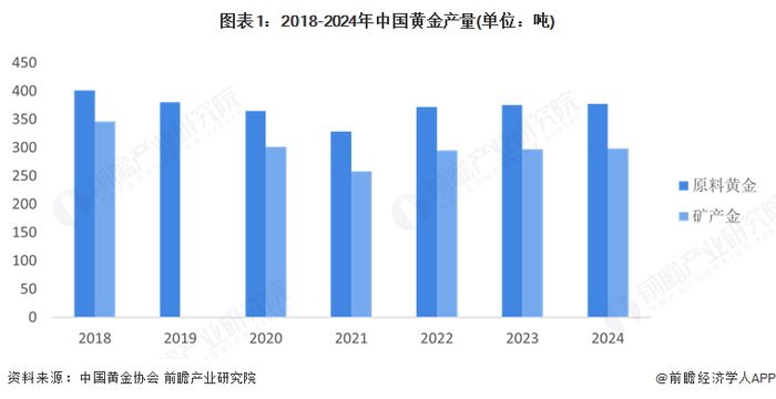2018-2024年,我国黄金产量呈现先下降后小幅增长趋势。2024年,国内原料产金377.24吨,比2023年增加2.09吨,同比增长0.56%,其中,黄金矿产金完成298.41吨,同比增长小幅0.39%。