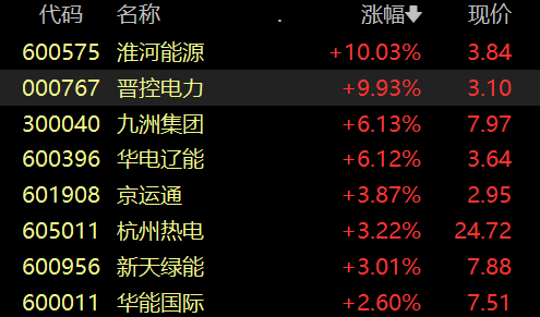 晋控电力涨停,淮河能源此前封板,华电辽能、九洲集团、京运通等涨幅居前。