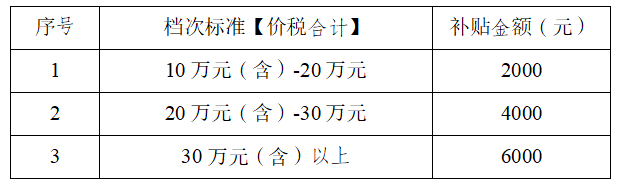 本次补贴活动预算1500万元,按照总额控制,不固定每档次名额,根据车辆购车发票【价税合计】金额划档: