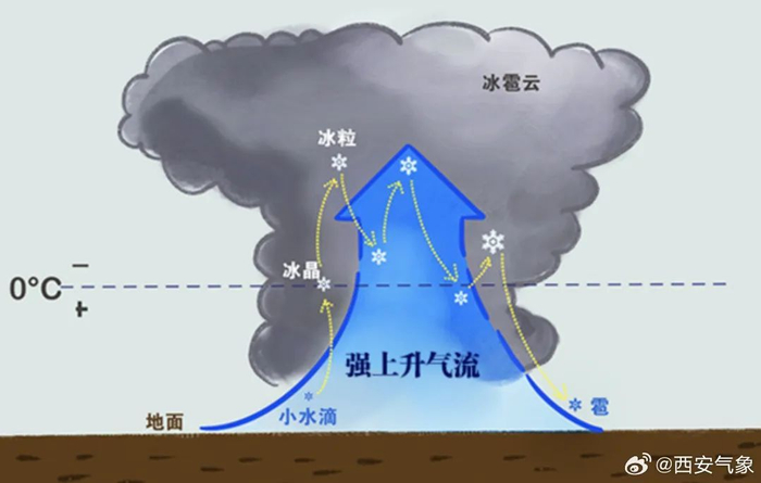 一场冰雹天气让许多西安市民心有余悸,也有网友猜测:是不是因为人工增雨造成的冰雹?对此陕西省气象局气象专家表示:冰雹是强对流天气中自然形成的现象,需满足云内存在强烈上升气流、过冷水滴与雹胚(如冰晶或尘埃)结合等条件。如果此时云中有大量水分,雹胚就会捕捉云中水分,使自身不断增大,最终形成冰雹。