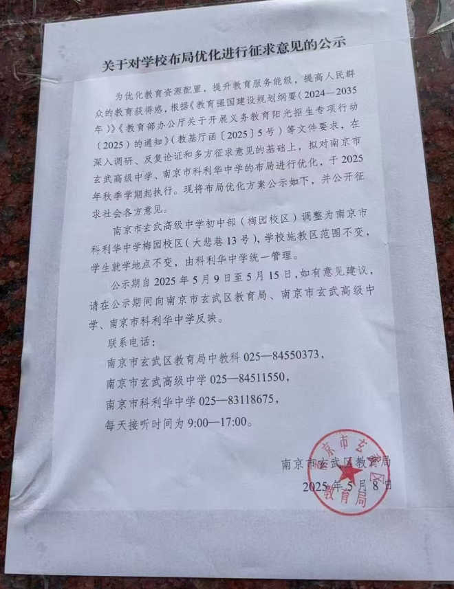 公示期自2025年5月9日至5月15日,如有意见建议,公示期间向南京市玄武区教育局、南京市玄武高级中学、南京市科利华中学反映。