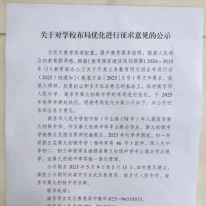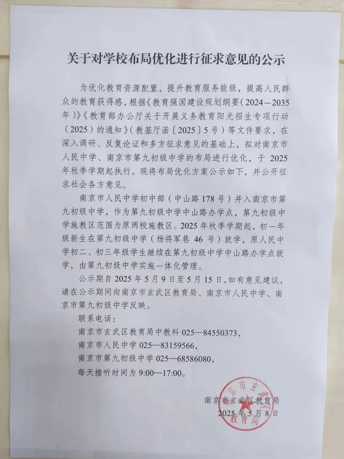 拟对南京市人民中学、南京市第九初级中学的布局进行优化,于2025年秋季学期起执行。
