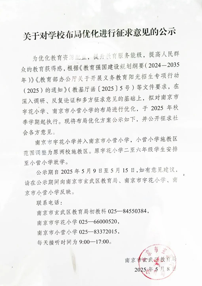 拟对南京市宇花小学、南京市小营小学的布局进行优化,于2025年秋季学期起执行。