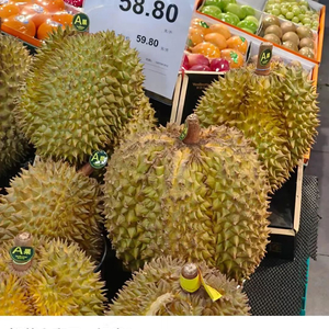 在宁波果品批发市场,“五一”之后的近一周榴莲到货量约为140吨,环比增加明显。目前在售的品种有金枕、甲仑、猫山王(冻果)等,主要货源地有泰国、越南、马来西亚。其中,金枕榴莲(B果)批发价格约20元至22/斤;金枕榴莲(A果)价格约25元至50元/斤不等。不少进口水果店把榴莲摆在抢眼的位置,价格也因品种、产地、成熟程度、出肉率不同而有差异。