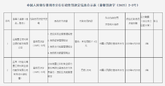 云南墨江农商行被罚37.4万元:因违反货币金银管理规定等
