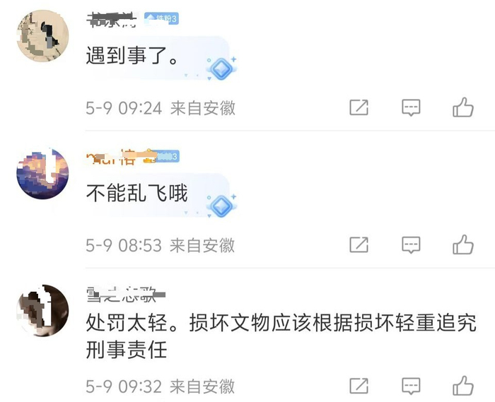 针对无人机穿越大理千年古塔落券洞事件,涉事“飞手”被行政拘留。网友对此事反应强烈,纷纷留言表示“摊上事了”,感慨“真不能乱飞”,还有人认为“处罚太轻了”。