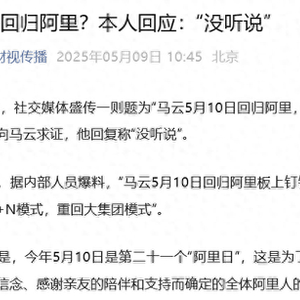据东方财经消息,5月9日上午,社交媒体盛传一则题为“马云5月10日回归阿里,将要重启大集团模式”的消息,财视传媒据此向马云求证,他回复称“没听说”。