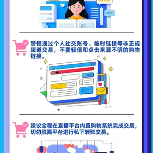 选择信誉良好、资质齐全、消费者评价较高的正规平台进行消费,核实商家的营业执照、经营资质等信息,确保其合法合规。警惕通过个人社交账号、临时链接等非正规渠道进行的交易,不要轻信和点击来源不明的购物链接。建议全程在直播平台内置购物系统完成交易,切勿脱离平台进行私下转账交易。