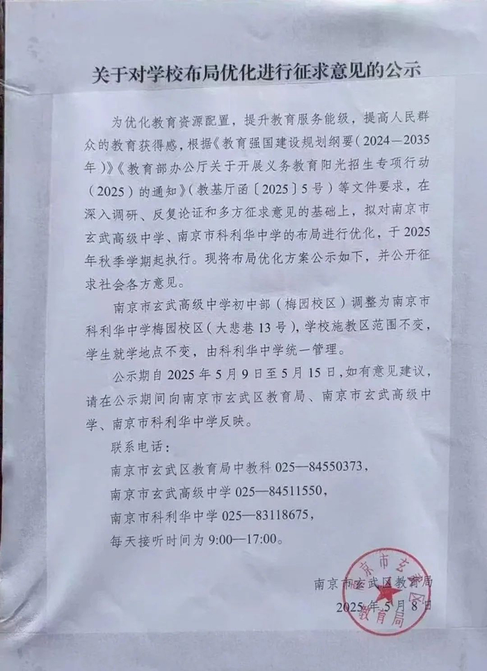 拟对南京市玄武高级中学、南京市科利华中学的布局进行优化,于2025年秋季学期起执行。布局优化方案公示,并公开征求社会各方意见。