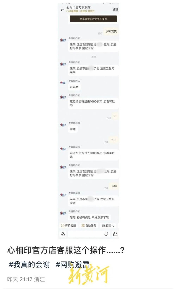 5月8日晚,有河南网友发文称,“去年在心相印买了厨房纸,一直延续到今天才跟客服说话。昨天买的杀菌湿巾,今天点开看主页写着2件均价44.9元,我看到了就去问客服,还没打出来下面的话,专属顾问22号就发来一排信息。我还以为我看错了,就在那里一个字一个字地看,就很疑惑,不理解。”根据该网友截图信息显示,客服向其发送大量侮辱性话语,还表示,“有本事您就去投诉,我们的客服经常这样回复,您要是投诉成功了,我们的店铺是怎么开到现在的,我们的客服就是这么嚣张。”