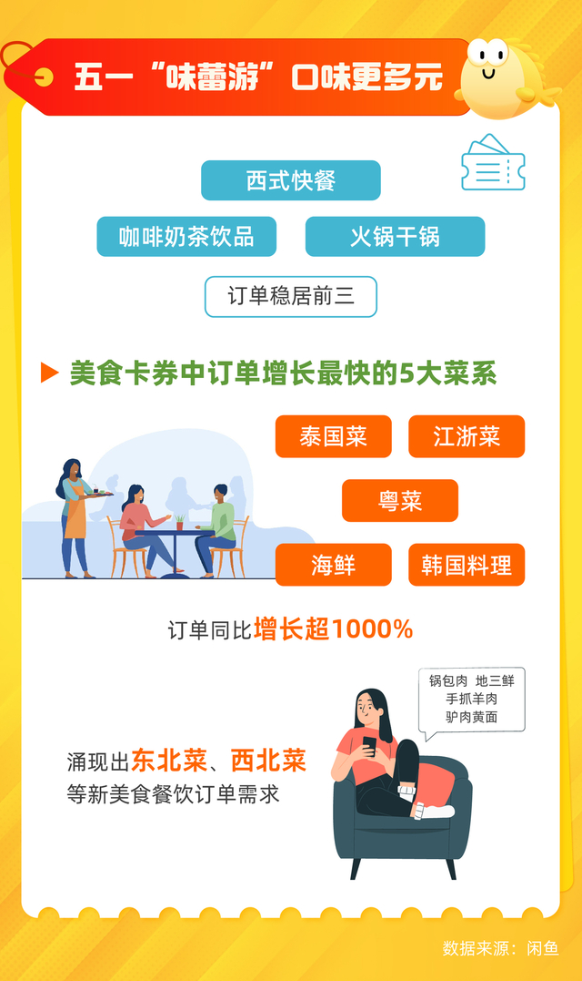 不仅要玩的舒心,也要吃的畅快,今年五一年轻人身体在路上的同时味蕾也没停下,和往年五一相比,今年闲鱼上美食餐饮类卡券消费进一步多元化,随着用户需求的增加,出现了东北菜、西北菜等新的类目。而与往年以西餐、咖啡奶茶、火锅干锅、川菜、湘菜长期霸榜的情况相比,今年泰国菜、江浙菜、粤菜、海鲜、韩国料理等餐饮券订单量排名增长迅速,同比增长均超1000%,尤其是粤菜订单同比增长1959%。