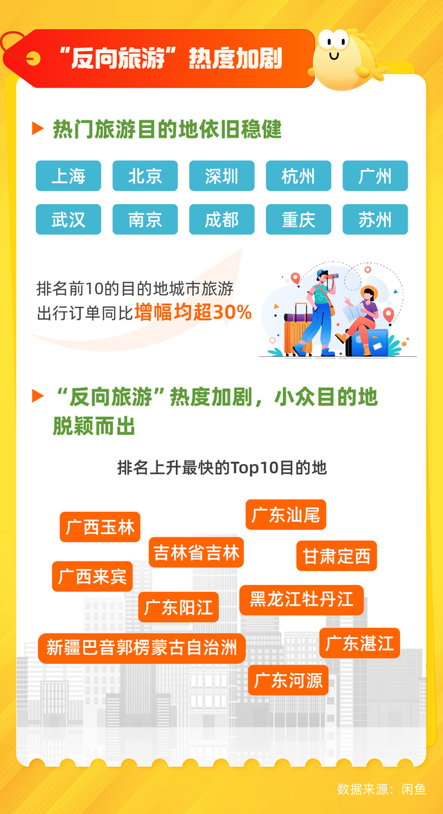 近年来,“反向旅游”的趋势越演愈烈,这一现象也同样在闲鱼上加剧,数据显示,尽管上海、北京、深圳、杭州、广州、武汉、南京、成都、重庆、苏州等城市仍旧是今年五一出游的主要目的地,订单增幅均超过30%,但广西玉林、吉林省吉林、广东汕尾、甘肃定西、广西来宾、广东阳江、黑龙江牡丹江、广东湛江、新疆巴音郭楞蒙古自治洲、广东河源等成了排名上升最快的出游目的地,不少都是充满烟火气的小城,反应出消费者追求“高性价比、体验更深入、拒绝拥堵”的旅行偏好。