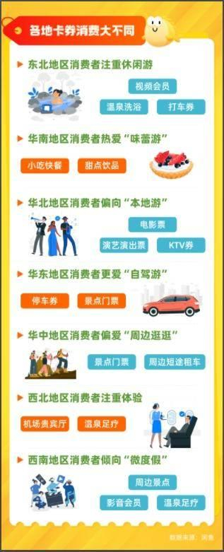 数据显示,东北地区消费者注重松弛感和休闲,视频会员、温泉洗浴、打车券订单占比高;华南地区消费者延续了其热衷美食的特色,深度践行“味蕾游”,各类美食、小吃等餐饮券订单较高;华北地区消费者偏向“本地游”,电影票、演艺演出票、KTV券等占比较高;华东地区消费者热爱“自驾游”,除了景点门票外,各类停车券成为其出行刚需;华中地区消费者更爱“周边转转”,景点门票、周边短途租车订单占比较高;西北地区机场贵宾厅消费最多;西南地区消费者倾向“微度假”,以周边景点、影音会员、温泉足疗等订单为主,主打一个距离近、体验强、身心都放松。