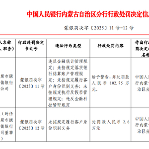 5月9日金融一线消息,中国人民银行内蒙古自治区分行行政处罚决定信息公示表显示,鄂尔多斯市康巴什村镇银行有限公司因违反金融统计管理规定、未按规定落实银行结算账户管理规定、未按规定履行客户身份识别义务、未按规定执行反假币管理规定、违反金融科技管理规定等五项违法行为,被给予警告,并处以102.75万元罚款。同时,刘某轶(时任鄂尔多斯市康巴什村镇银行有限公司董事长)因对未按规定履行客户身份识别义务负有责任,被处以2.6万元罚款。
