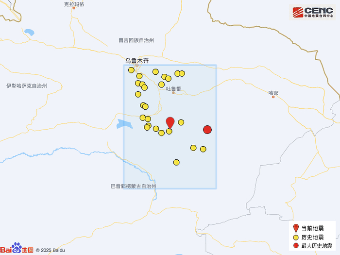 历史地震:根据中国地震台网速报目录,震中周边200公里内近5年来发生3级以上地震共27次,最大地震是2022年6月24日在新疆吐鲁番市鄯善县发生的5.1级地震(距离本次震中135公里),历史地震分布如图。